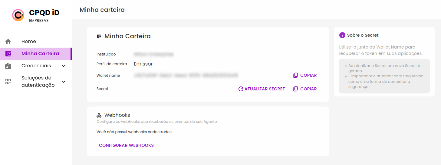 No portal iD Empresas é possível recuperar os dados de acesso às APIs da plataforma iD. No menu “Minha Carteira”, observe os valores dos campos Wallet Name e Secret, pois eles serão utilizados durante as requisições das APIs.