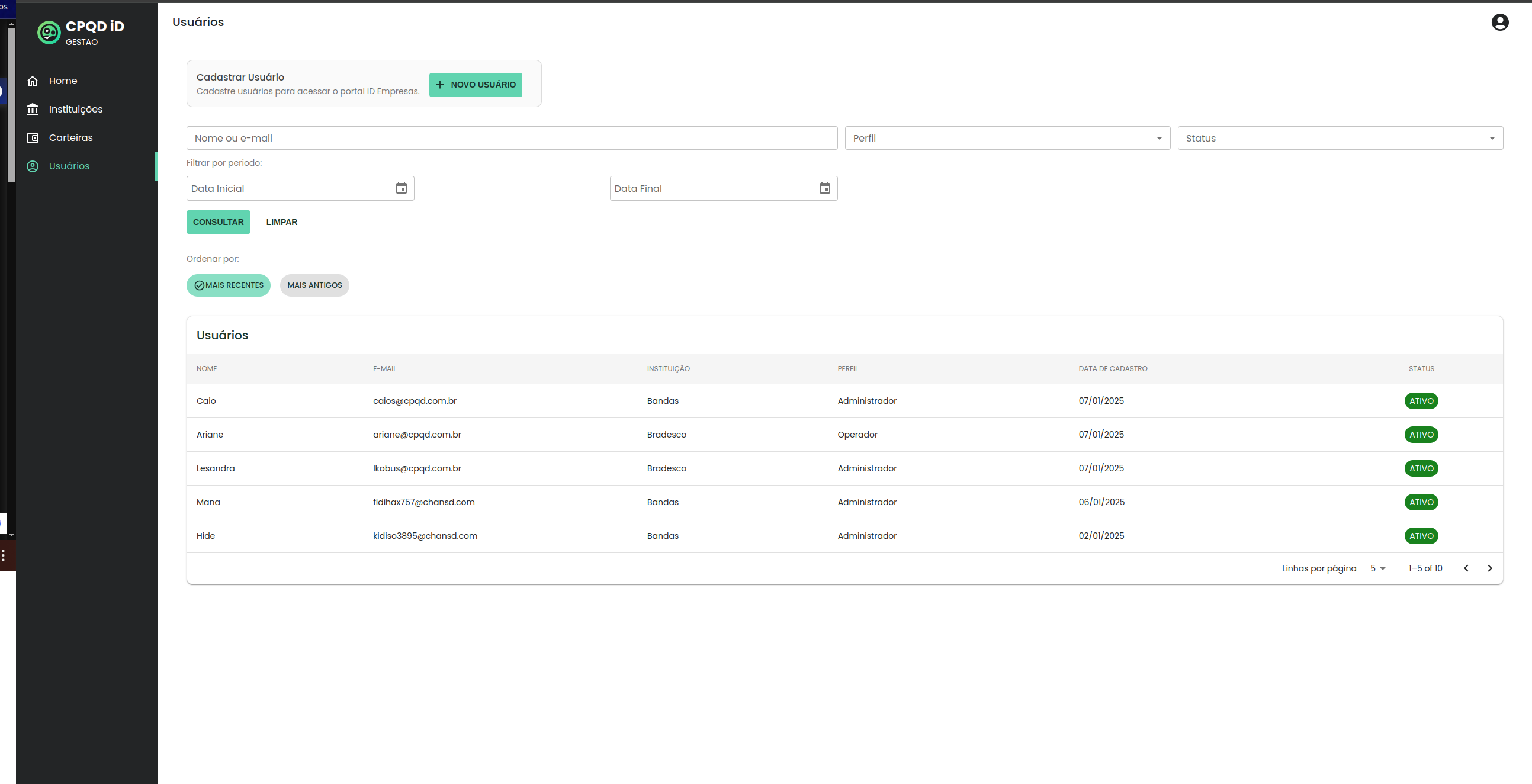 O Portal de Gestão do iD CPQD é uma plataforma centralizada que permite o gerenciamento completo de instituições, empresas e usuários dentro do ecossistema de identidade digital descentralizada. A interface é intuitiva e organizada, proporcionando uma experiência de uso eficiente e prática.